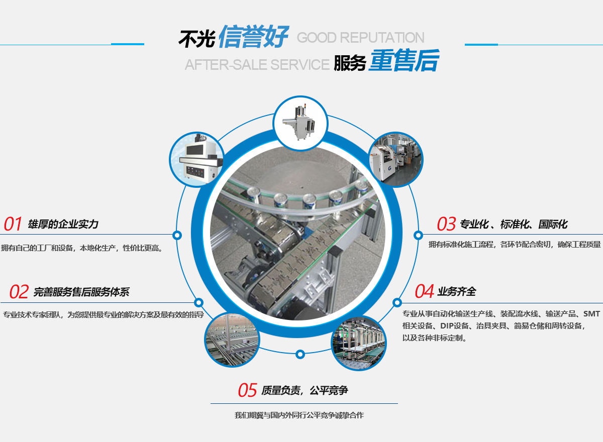 我公司致力于電子、工業(yè)新技術(shù)推動(dòng)的新產(chǎn)品工藝的設(shè)備配套,專業(yè)從事自動(dòng)化輸送生產(chǎn)線、裝配流水線、輸送產(chǎn)品、SMT相關(guān)設(shè)備、DIP設(shè)備、治具夾具、簡(jiǎn)易倉(cāng)儲(chǔ)和周轉(zhuǎn)設(shè)備,以及各種非標(biāo)定制.....